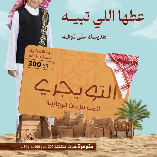 بطاقة هدايا مسبقة الدفع من التويجري للمستلزمات الرجالية، متوفرة من 100ريال وحتى 450 ريال، وتعتبر الهدية المثالية لكل المناسبات.